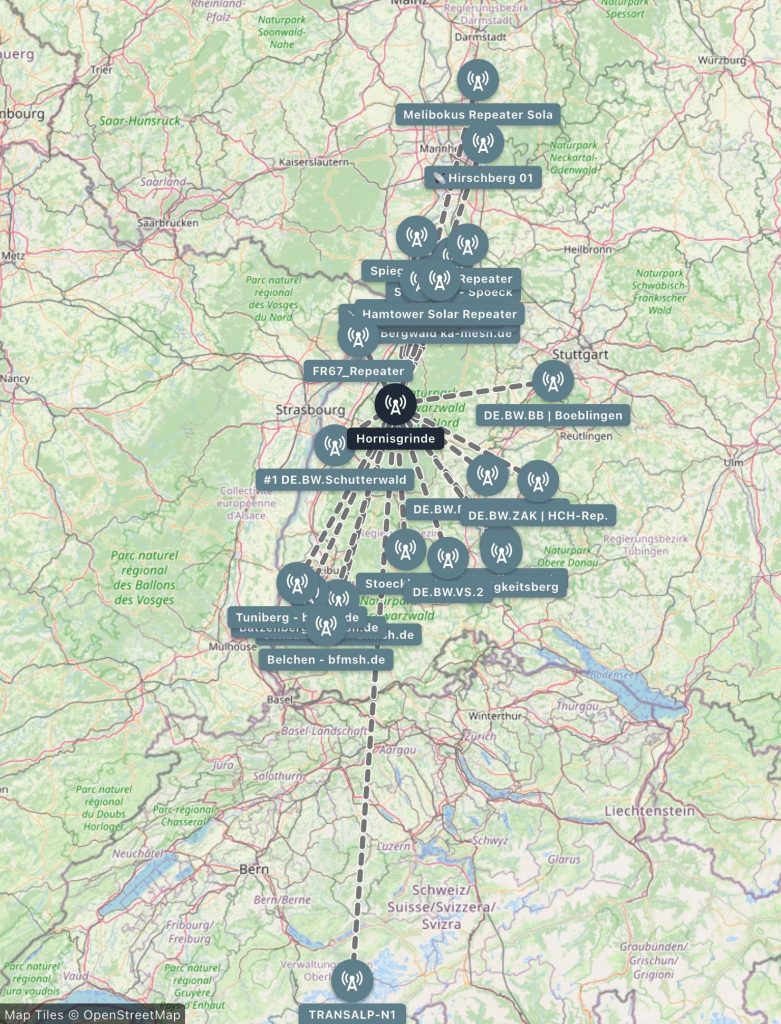 Nach dem Test am 16.-17.02.2026 ist der Repeater auf der Hornisgrinde seit dem 07.03.2026 fest installiert. Die Antenne wird in den nächsten Wochen noch durch eine 5dBi Antenne ersetzt und ca. 4m höher installiert. Von der exponierten Lage werden aktuell 32 Repeater u.a. in Karlsruhe, Böblingen, Batzenberg,Belchen, Dreifaltigkeitsberg, Klippeneck, Schutterwald, Stoecklewald, Tuniberg, Hirschberg sowie der Melibokus und der Transalp-Repeater N1 direkt erreicht.